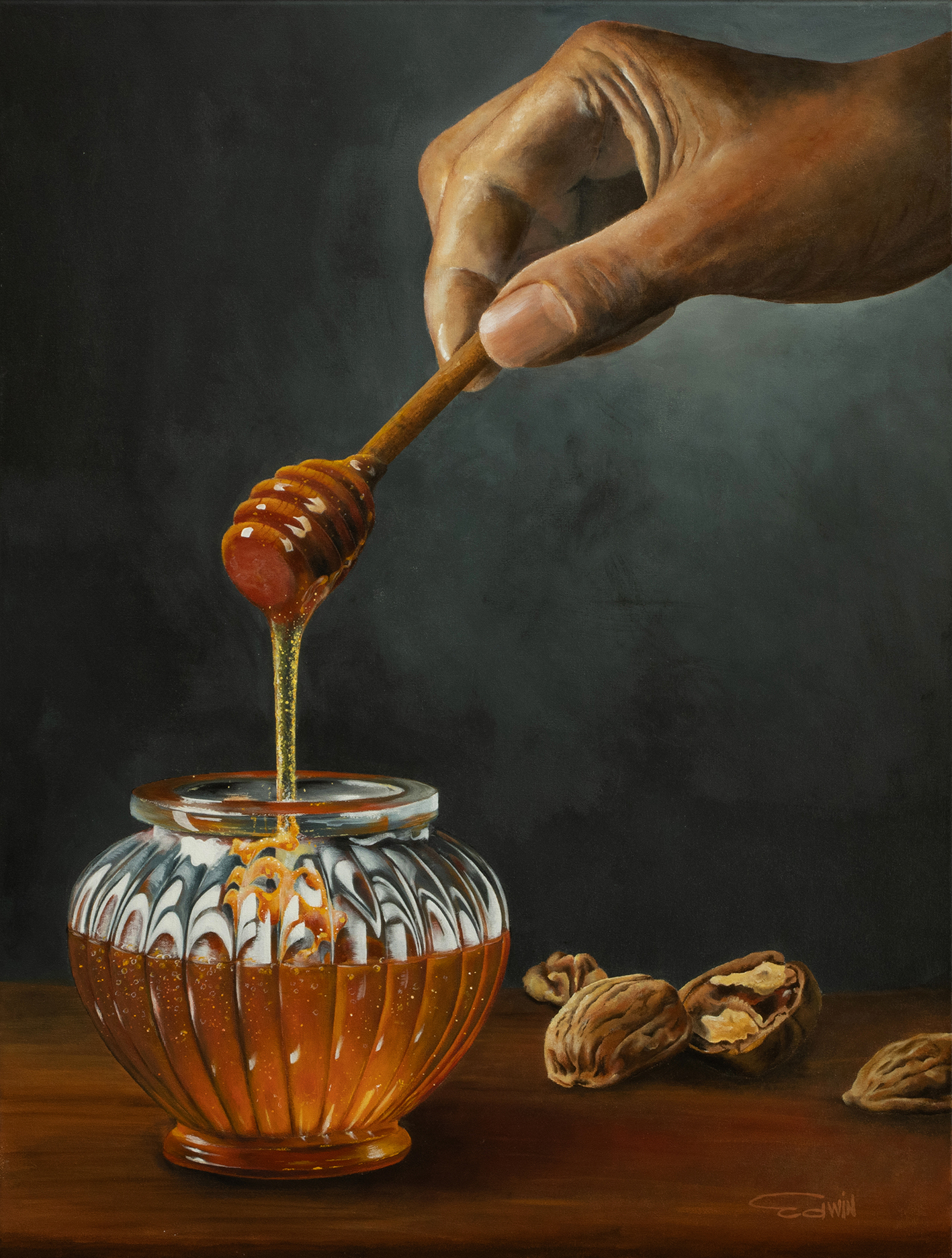 Als je zijn nieuwste schilderijen bekijkt, vermoed je terecht een achterliggend idee. Edwin laat het echter aan de kijker over om die te ontdekken en daar een eigen conclusie aan te verbinden.
